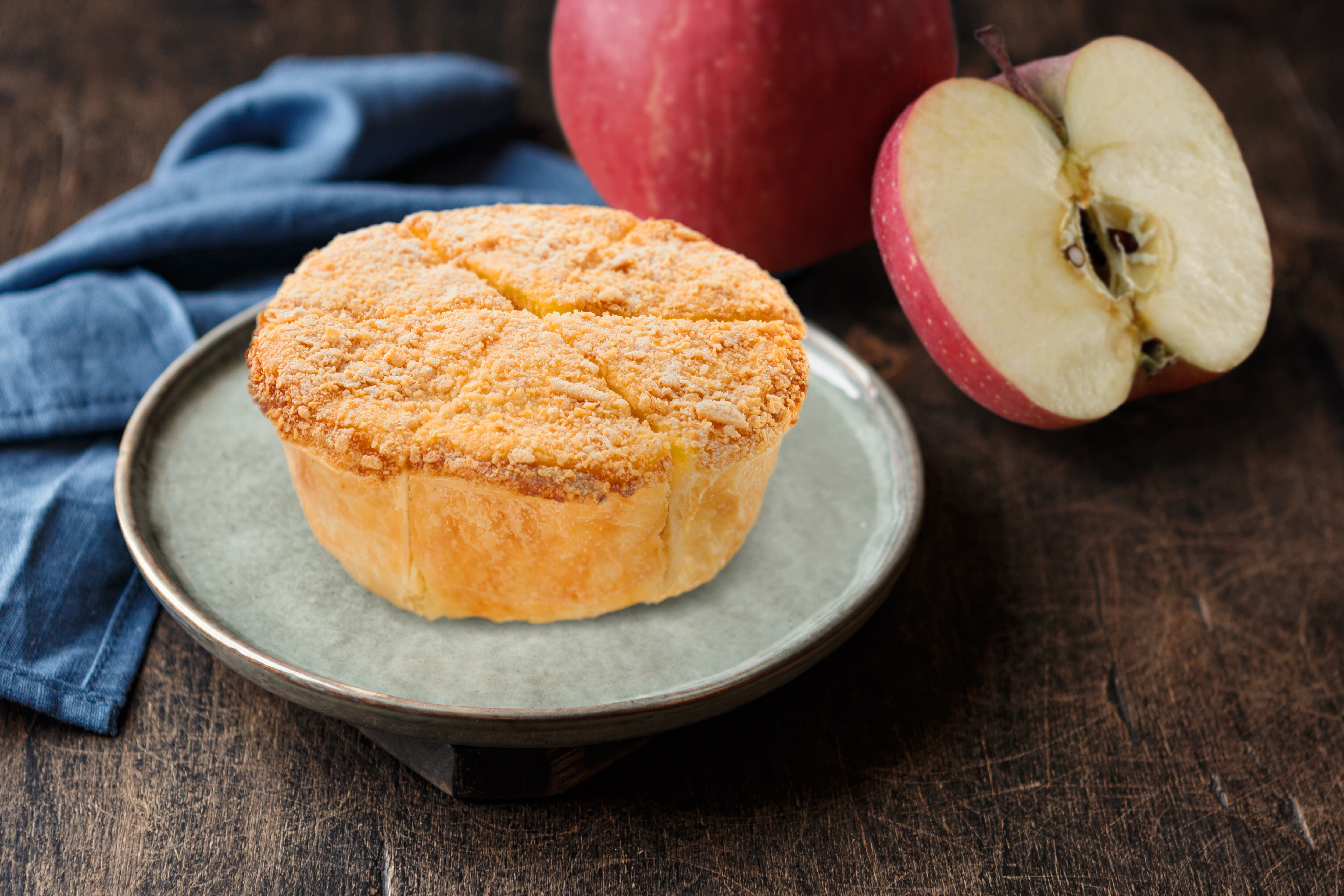 大きくカットしたふじリンゴと甘さ控えめのカスタードクリームがサクサク生地に包まれています。リンゴがたくさん入っているので見た目よりずっしり。今回さらにブラッシュアップされリンゴのシャキシャキ感が更にアップしました。リンゴとカスタードクリームがお口の中で一体となり幸福感を感じられます。ご家族でシェアしませんか?ひと口食べれば幸せいっぱい甘酸っぱい!