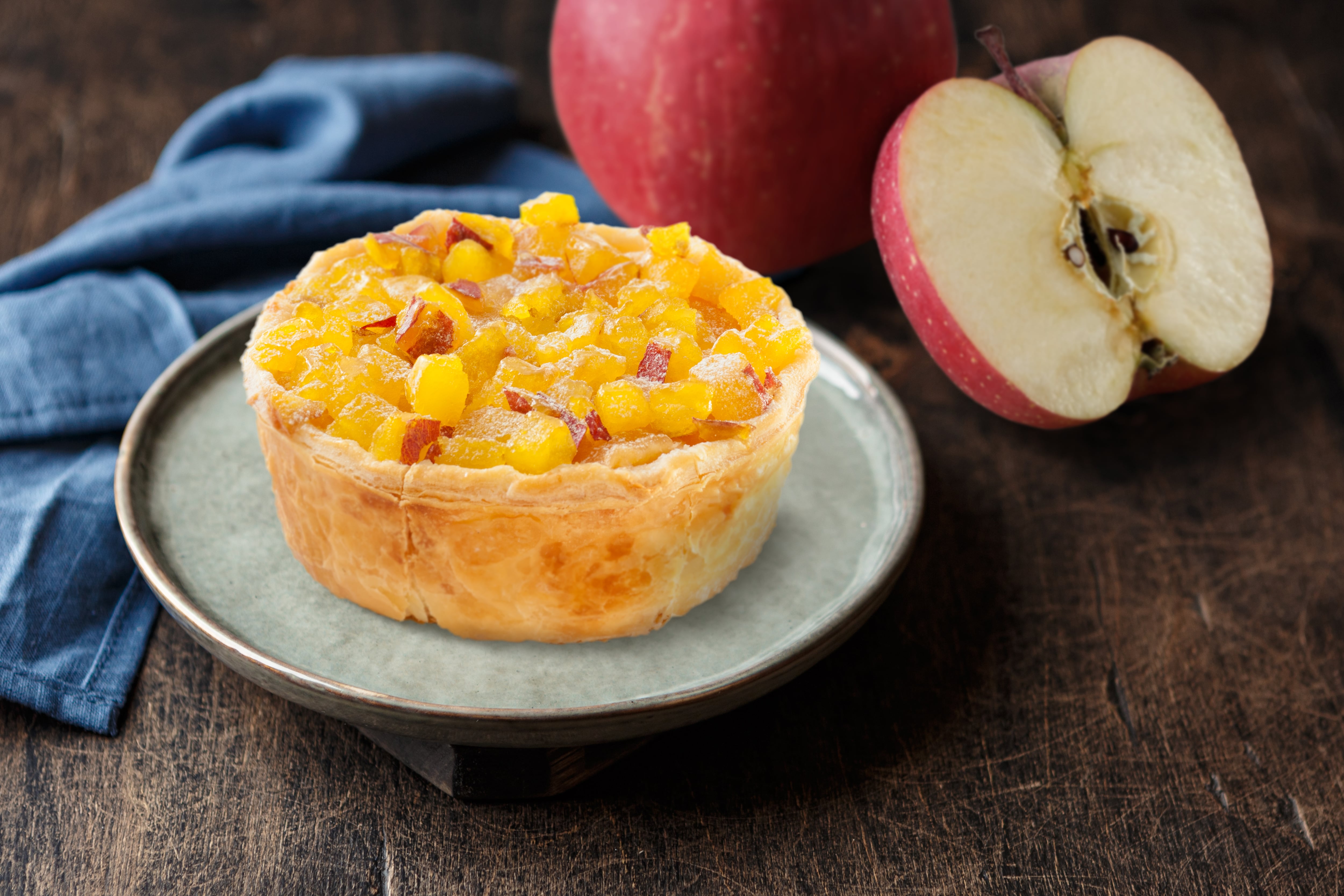 自社で焼き上げるフレッシュバターたっぷりのパイ生地にたっぷりのリンゴのパイに鳴門金時ダイスをトッピング。りんごの酸味と鳴門金時ダイスの自然な甘さが絶妙なバランス。